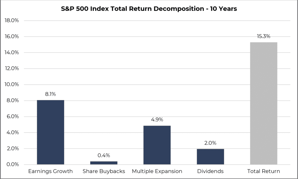 - Multiple Expansion/Contraction: whether investors are willing to pay more or less for each dollar of earnings.